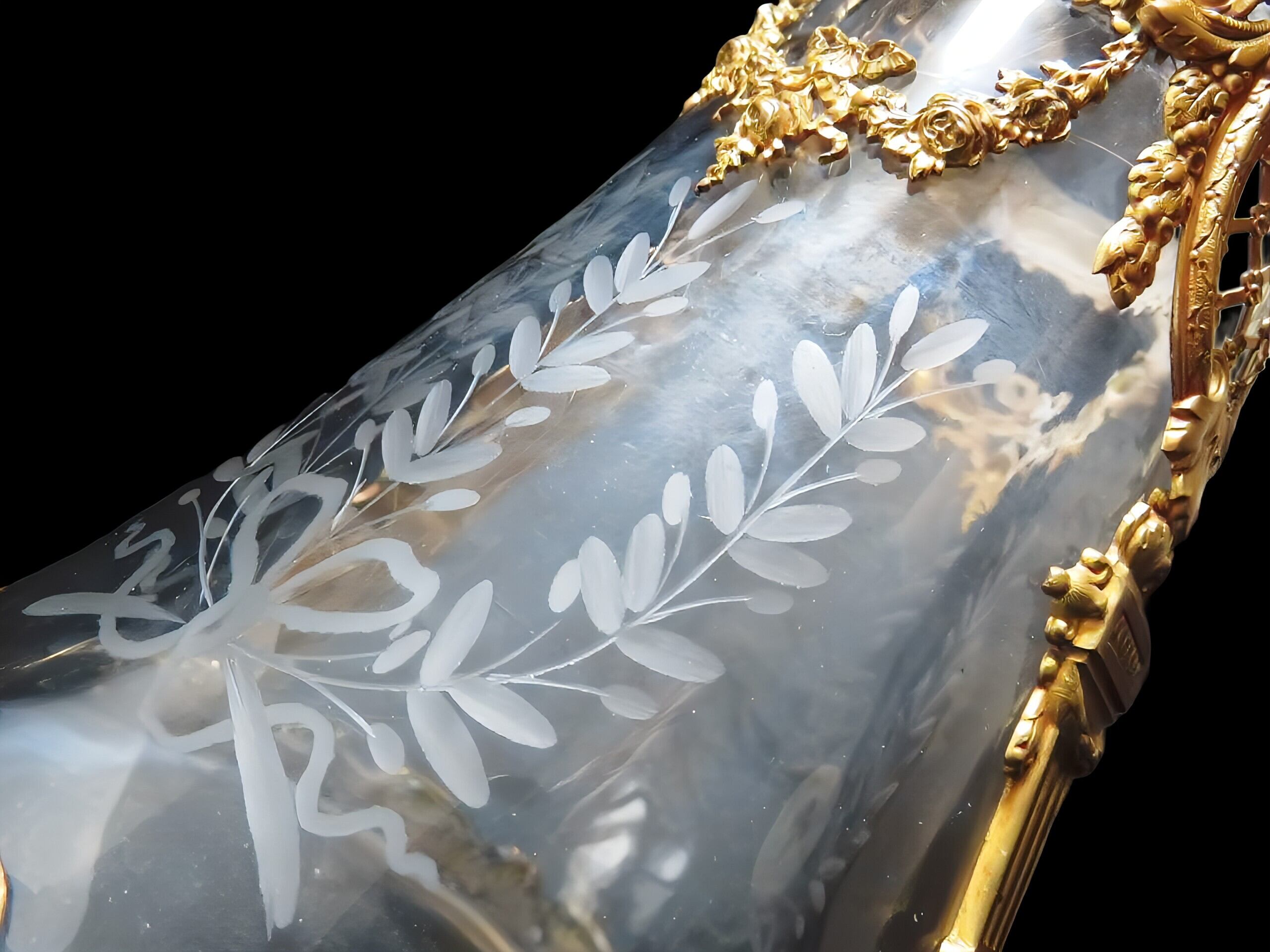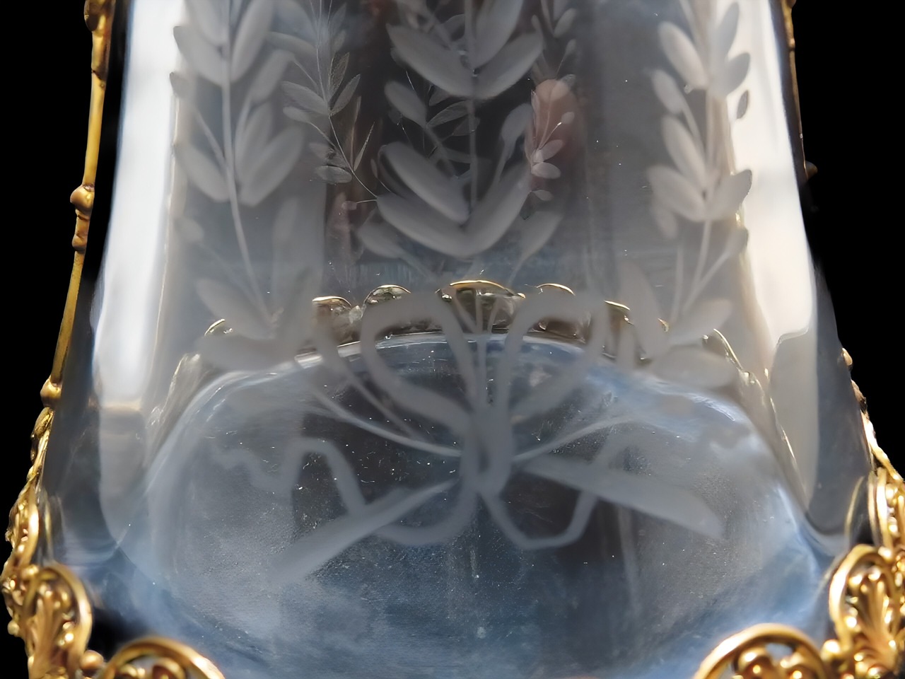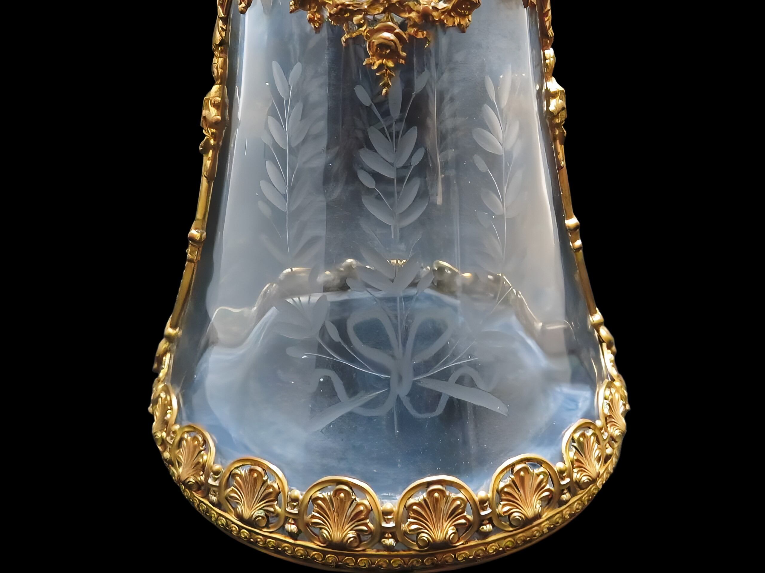 重厚なクリスタルガラスに繊細なリボンとオリーブのグラヴィール彫刻が