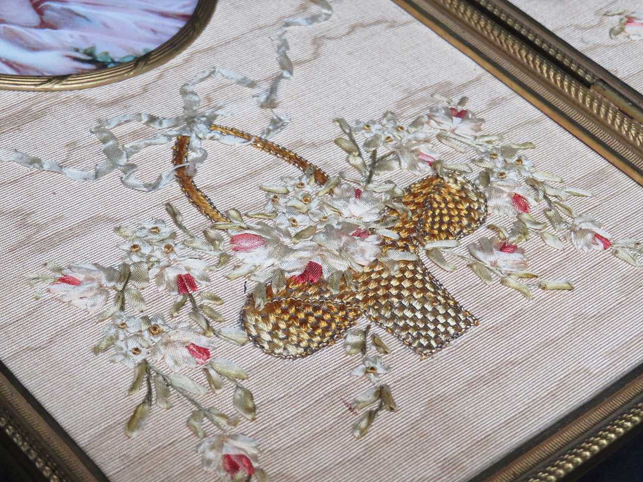 オルモルフレームのモワレ地にふんわり花かごのリボンワーク刺繍と